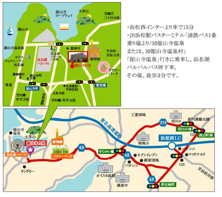 施設概要 浜松市内第1号の全施設個室ユニット型の特養です。 介護をするのではなく生活を支援させて頂きます。 舘山寺温泉と浜名湖の景色を見ながらゆったりとした生活を提供していきます。 外観1 外観2 美しい景観 概要・アクセス 名称 特別養護老人ホーム 舘山寺の里 所在地 〒431-1209 静岡県浜松市西区舘山寺町463番地の1 建物 本館:鉄骨造 地上6階建て北館:鉄骨造 地上3階建て 延床面積 本館:7,280㎡ 北館:3,430㎡ 定員 入所(小規模生活単位型指定介護老人福祉施設):130名 ショートステイ(短期入所生活介護):20名 デイサービス(通所介護/併設型):30名 電話番号 053-487-3050(代) FAX 053-487-3054 設置主体 社会福祉法人 庄栄会 [法人本部住所] 〒431-1209 静岡県浜松市西区舘山寺町2418番地の1 法人関連施設:舘山寺保育園/昭和55年設立・認可 サービス内容 入浴 週2回以上(一般浴・イス浴・寝浴) 食事 7:30、12:00、18:00/各種に対応します 洗濯 下着類施設で対応(無料) 排出 自立支援、オムツ交換随時 健康管理 (月1回) 嘱託医による診察 クラブ活動 レクリエーション 家族会など クラブ活動・・お花クラブ・書道クラブ等 レクリエーション・・ドライブ・誕生者会・舘山寺の花火大会他 家族会・・ユニット毎・全体 来訪・面会 面会時間は 8:30~20:00の間です 外出・外泊 入居者の外出・外泊の際には施設職員に申し出いただき「外出・外泊届」のご記入をお願いします 公示書類 舘山寺の里 重要事項説明書 舘山寺の里 個人情報管理規定 苦情を処理するために講ずる処置の概要 館内・各施設の案内 ホール 浴室 居室風景 展望檜風呂 書道展 受付 施設のご利用料金について 料金表はこちらよりご確認ください(PDF) 交通情報
